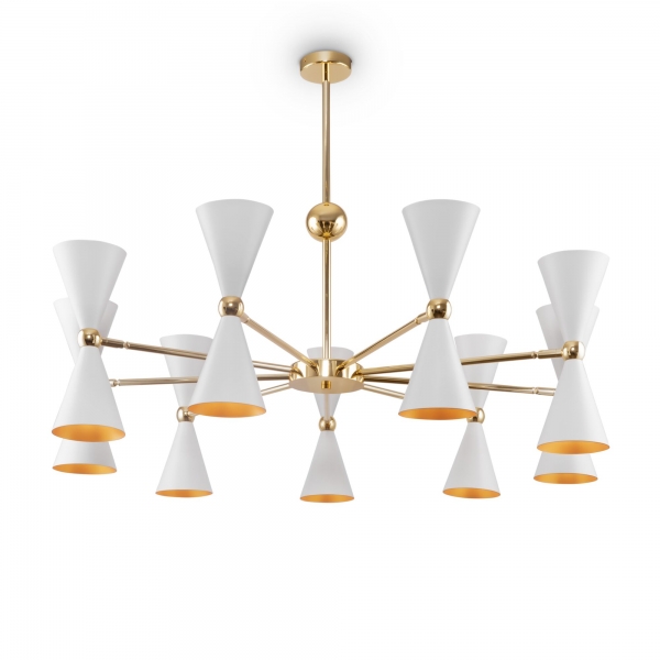 Kovové závesné svitiedlo. Tienidlá sú k dispozícií v dvoch farbách: čierna so zlatou a biela so zlatou. Ramená sa dajú polohovať pre lepšie nastavenie svetla.