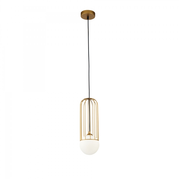Závesné svietidlo s dekoratívnym kovovým rámom a sklenným difúzerom.