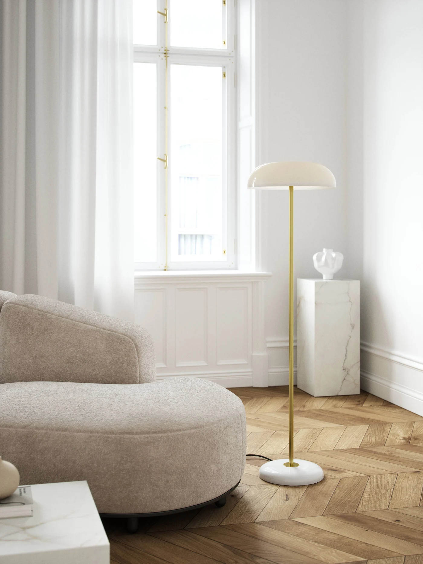 Glossy je stelesnením vkusného a sofistikovaného dizajnu. Dánska dizajnérka Maria Berntsen vytvorila stojaciu lampu, ktorá vyžaruje severský minimalizmus, kde kombinácia exkluzívnych materiálov ako mramor, brúsená mosadz a opálovo biele sklo prispieva k neuveriteľne elegantnému dizajnu.