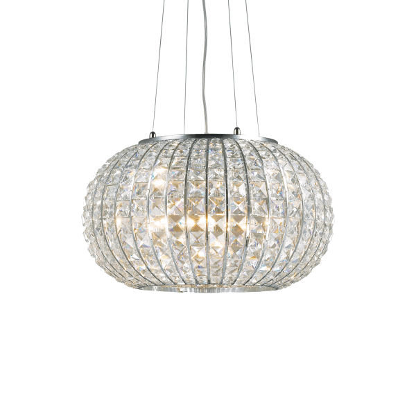 Séria Calypso od spoločnosti Ideal Lux, Vám ponúka štýlové svietidlá ponúka závesnú a stropnú verziu vo viacerých veľkostiach a taktiež nástennú a stolovú verziu v rovnakom dizajne. Tienidlo svietidla pozostáva z drobných krištálikových štvorčekov osadených po celom obvode kovovej konštrukcie, čo pri zasvietení svietidla vytvára zaujímavý svetelný efekt.